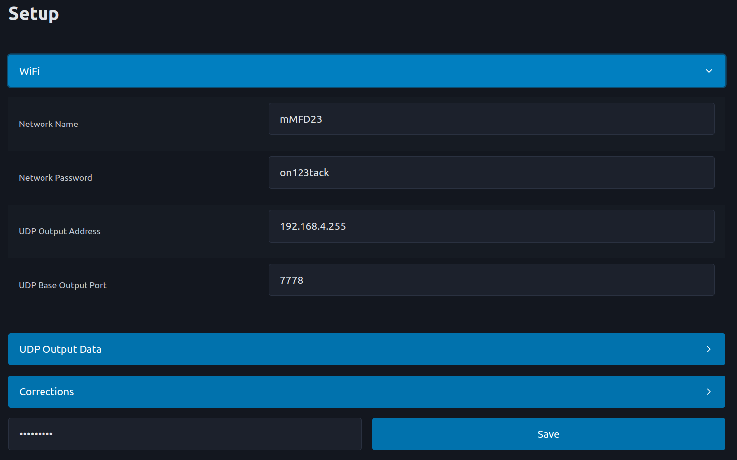 Finally we must setup the UDP data output. We use the mMFD broadcast address of 192.168.4.255 and the base port of 7778 (NMEA0183 port will be 7778+1=7779)
