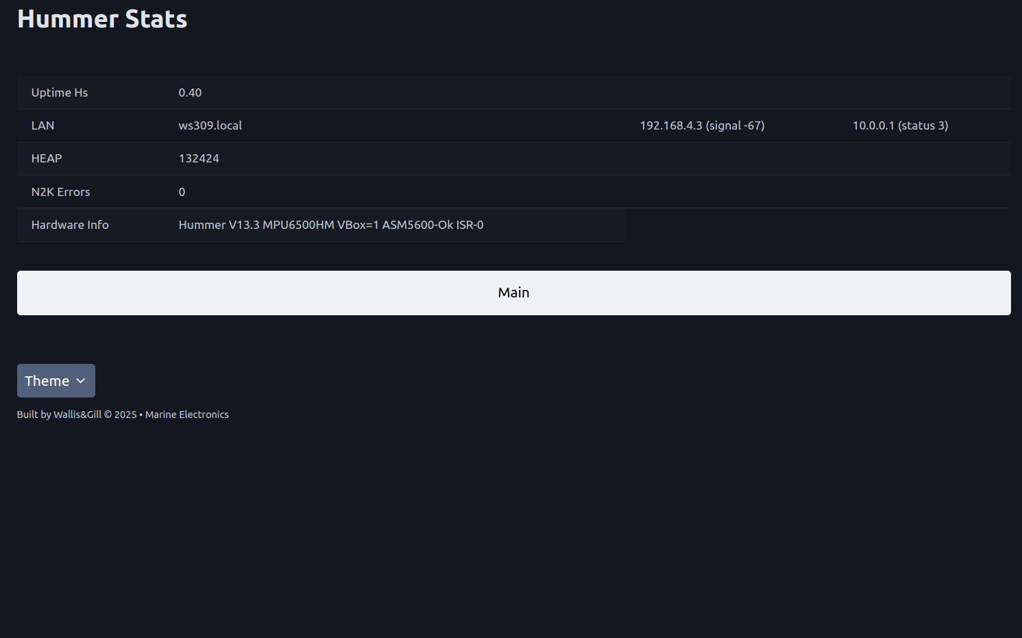 After the Hummer connects to this network (we may speed up things by rebooting it by cutting power) we verify that it is connected via the /stats/ page. This page can be accessed via the bottom of the setup page or by directly entering the URL http://10.0.0.1/stats/ note the trainling /. We verify via the LAN data line. Looking for an mMFD assigned IP of class 192.168.4.x. In the image below we see it is connected and see an OK wifi signal strength of -67 (-40 would be better, -80 worse).
